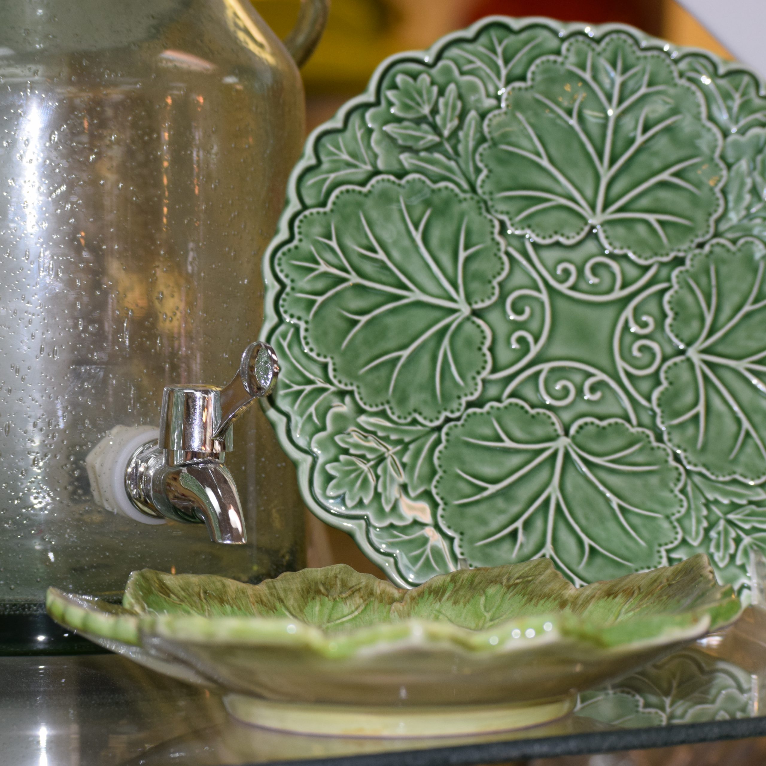 CLOCKWISE FROM TOP: Good Earth Potter – The Everyday Gourmet; Acrylic Tumblers – Bliss Gift and Home; Green Home Decor – Mockingbird Marketplace; Decorative Floral Dishes – The Paper Place; White Dinnerware – Bliss Gift and Home; Chartreuse Napkin and Napkin Ring – Mockingbird Marketplace