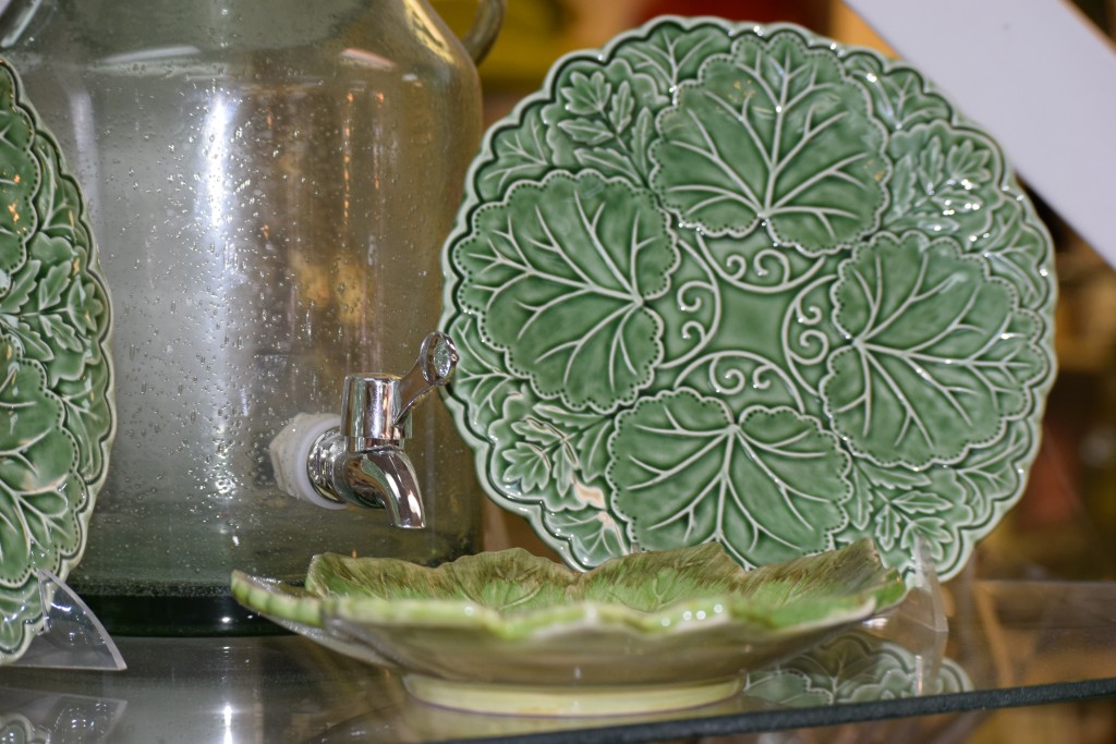 CLOCKWISE FROM TOP: Good Earth Potter – The Everyday Gourmet; Acrylic Tumblers – Bliss Gift and Home; Green Home Decor – Mockingbird Marketplace; Decorative Floral Dishes – The Paper Place; White Dinnerware – Bliss Gift and Home; Chartreuse Napkin and Napkin Ring – Mockingbird Marketplace