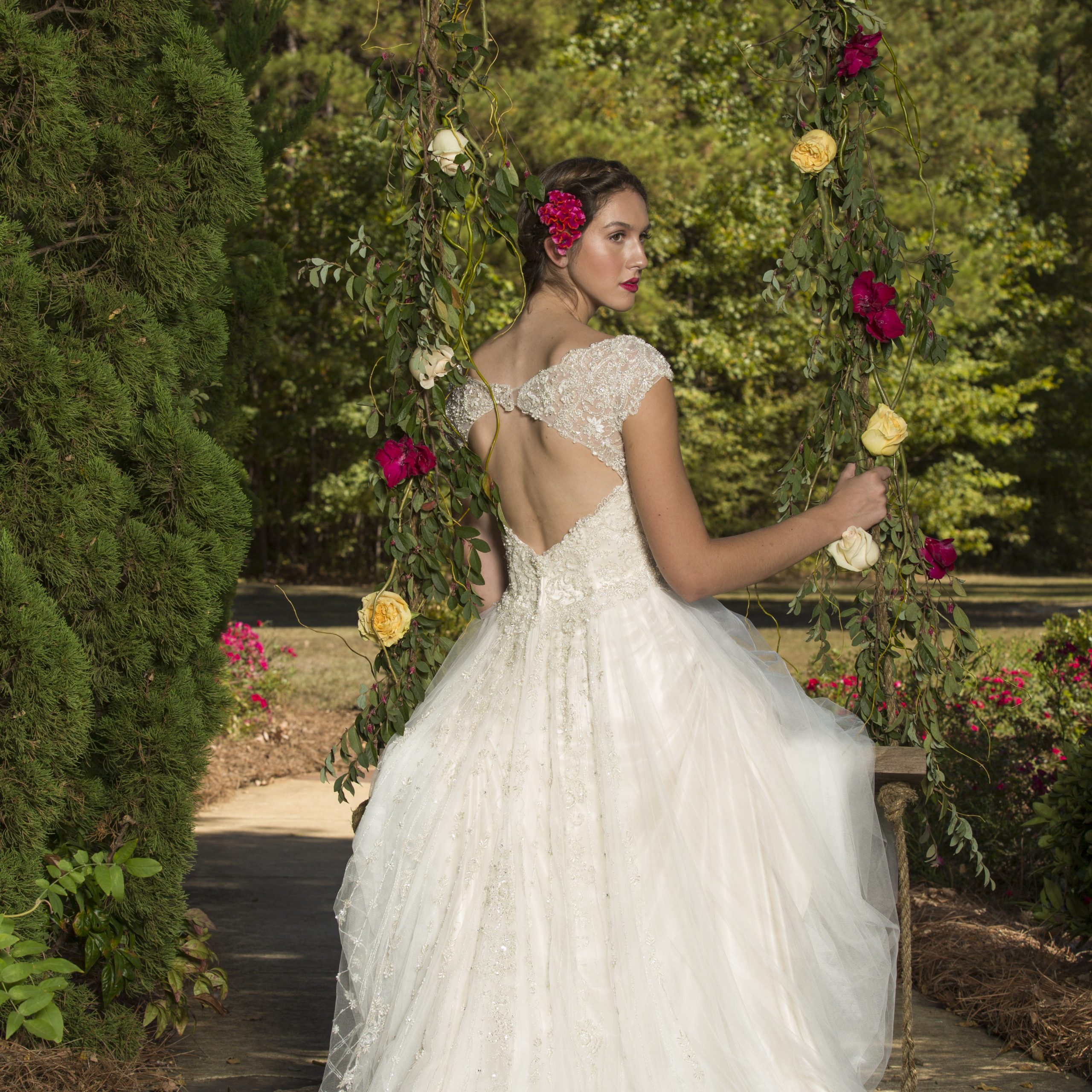 Once upon a time not so very long ago, bridal style took a turn towards couture gowns designed for dramatic impact with plunging necklines and architectural details. The clock has struck twelve on this dramatic trend as romantic and enchanting bridal styles are making a return in 2016. The top bridal designers are showcasing dreamy gowns of delicate lace, intricate beading, and full princess skirts. This year’s fanciful designs have a more modest look with glamorous long sleeves or fairy-dusted beaded bodices with delicate shoulder straps or cap sleeves. What better way to showcase these ethereal gowns than in the wooded fairy tale setting of McClain Lodge. Enjoy Premier Bride of Mississippi’s Premier Picks for our favorite fanciful fairy-tale gowns!