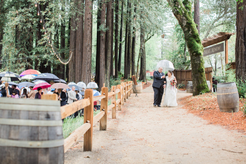 Shelly and Jonathan Higgins planned a romantic, intimate celebration in an outdoor setting, but Mother Nature had other plans. “The ceremony was in the rain—which actually made this wedding even more romantic,” recalled family friend and wedding photographer Angela Mannino of Angela Sue Photography. “It provided such a gorgeous backdrop for photos, too! With the fog rolling in over the hills above the vineyards, there was no way we were going to get any bad photos.”