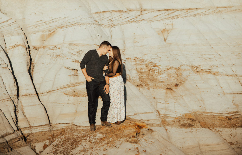 “I have been dying to shoot in Drumheller!” Brina said. “When Brittany said they are down to shoot anywhere and ready for anything my heart skipped a beat. I love adventurous couples. When you trust me to guide the session it makes me so happy. So Drumheller it was, a gorgeous clear day and these two full of love. Brittany literally didn’t stop smiling the whole shoot. SUCH A RAD COUPLE. We hiked, we scaled rocks and it was damn amazing.”