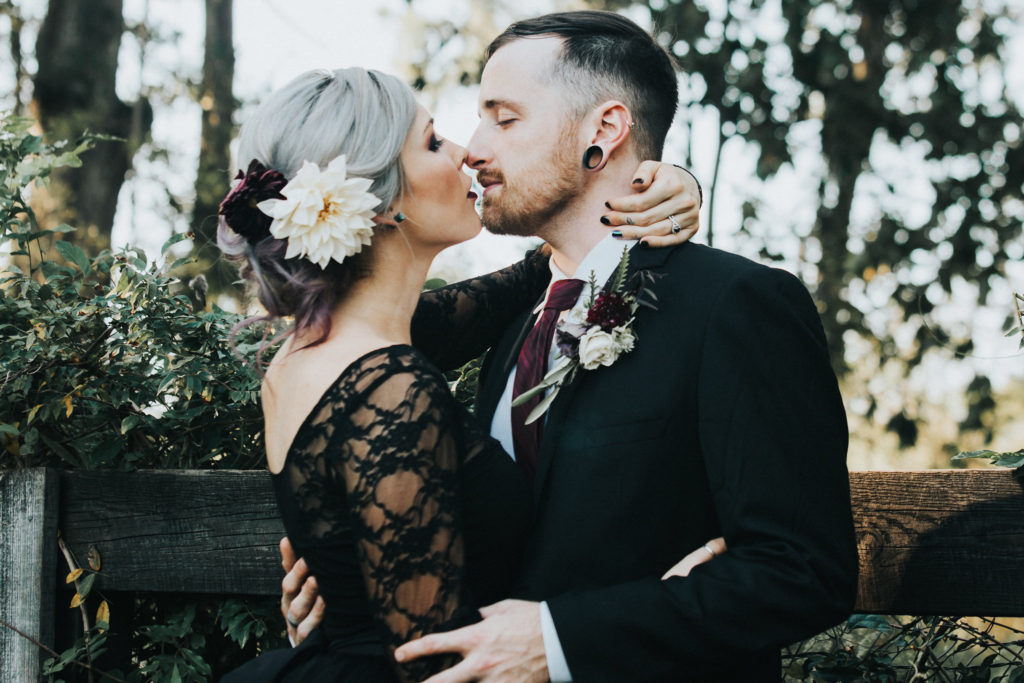 Event planner Sarah Elizabeth Miller styled this dramatic, Halloween-themed shoot. Steely Keys and Paul Ollinger, who play the roles of bride and groom, are a real-life, engaged couple. Atlanta-based fashion designer BekahBea designed Steely’s gorgeous gown. The beautiful bridesmaid is local model Hannah Lee Yoder.